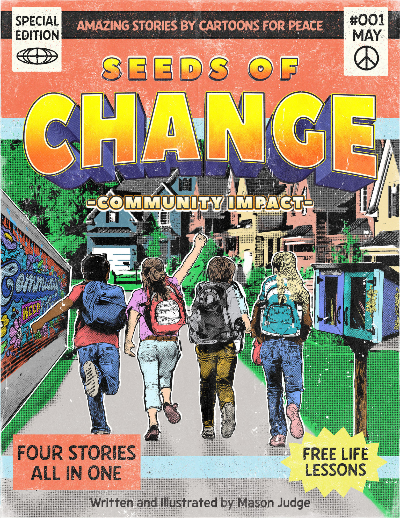 “Cartoons for Peace and Justice,” a project of SOS ART, consists of a series of cartoon books, each on a given theme of peace and justice. Each book, composed of two stories on the same theme, is illustrated by two different Greater Cincinnati artists or groups of artists. These books are given free to local elementary and middle schools to share with their students and have their content discussed at some point in the classroom; also with the hope to trigger in the students artistic creativity in line with the addressed theme. The first 10 books published are respectively on the theme of Environment, Hunger, Endangered Animals, Negative Effects of Technology, Responsibility, Acceptance and Harmony (Tolerance), Neurodiversity, Compassion, Anxiety and Depression, and Gentrification. The three newest ones are: 1) on the theme of Community: “Community Is Where the Heart Is,” written and illustrated by Amanda Bollman; and “Seeds of Change,” written and illustrated by Mason Judge; 2) on the theme of Gratitude: “Learning to be Grateful,” written by Azra Bhagat and illustrated by Ed Mettler; and “American Lunch,” written and illustrated by Jessicalina Tongono; and 3) on the theme of Mental Well-Being: “Monsters,” written and illustrated by Sam Curoe; and “Burnout,” written and illustrated by Kai Miller. Please feel free to share these books with children you know and to contact us (sosartcincinnati@gmail.com) for any additional questions or information.