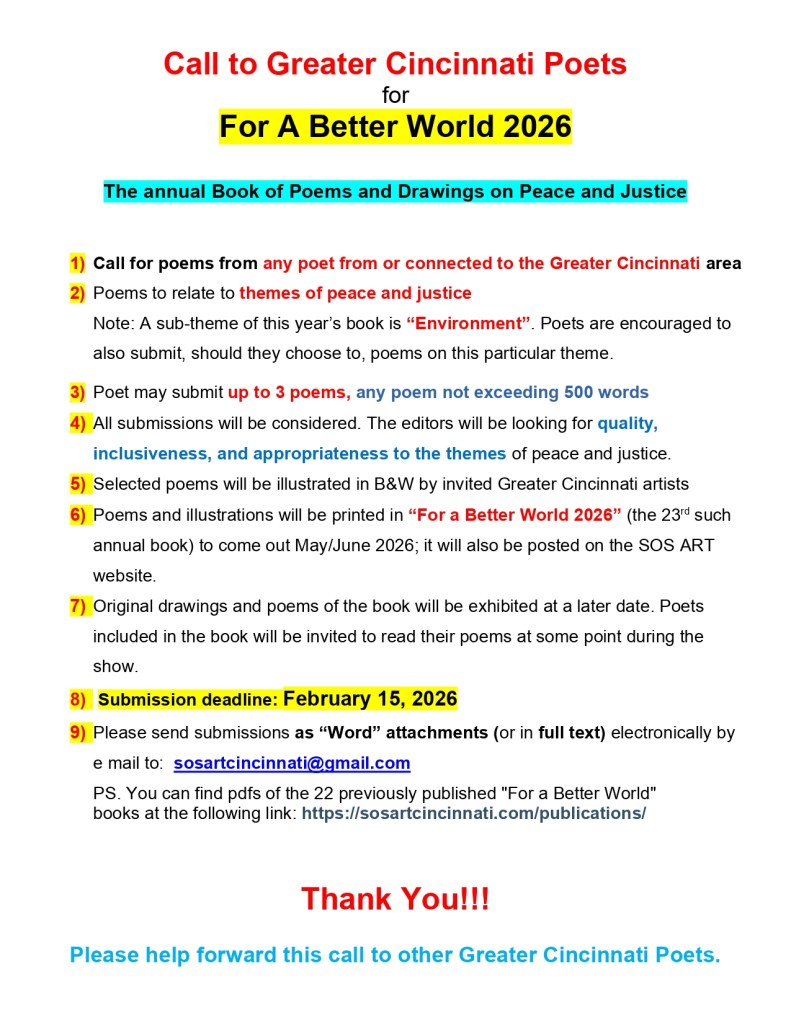 “For A Better World 2025” is the 22nd annual book of Poems and Drawings on Peace and Justice by Greater Cincinnati Artists published by SOS ART. It includes poems by 96 local poets and drawings by 40 local visual artists, all on the themes of peace and justice. The book is dedicated to the memory of Gary Gaffney, a strong supporter of SOS ART and a long time member on its board. Gary passed away on February 14, 2025.