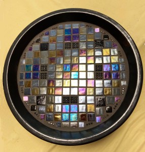 “The iridescence of the glass mosaics in a simple planter saucer elevates a modest utilitarian object to a beautiful work of art.”