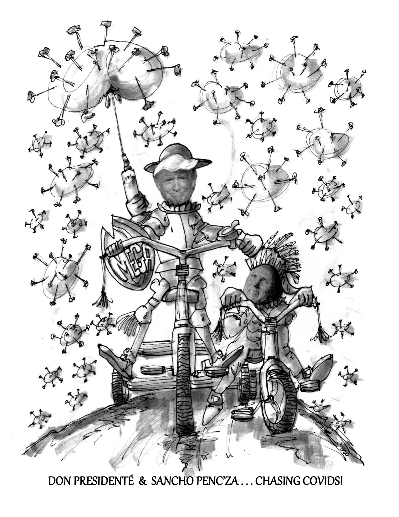 “This political cartoon is a self-evident slap at the ineptitude, denial and wishful thinking of our current Presidential Administration in dealing with the Covid 19 Pandemic. It borrows from the obvious literary reference of Don Quixote chasing windmills.”