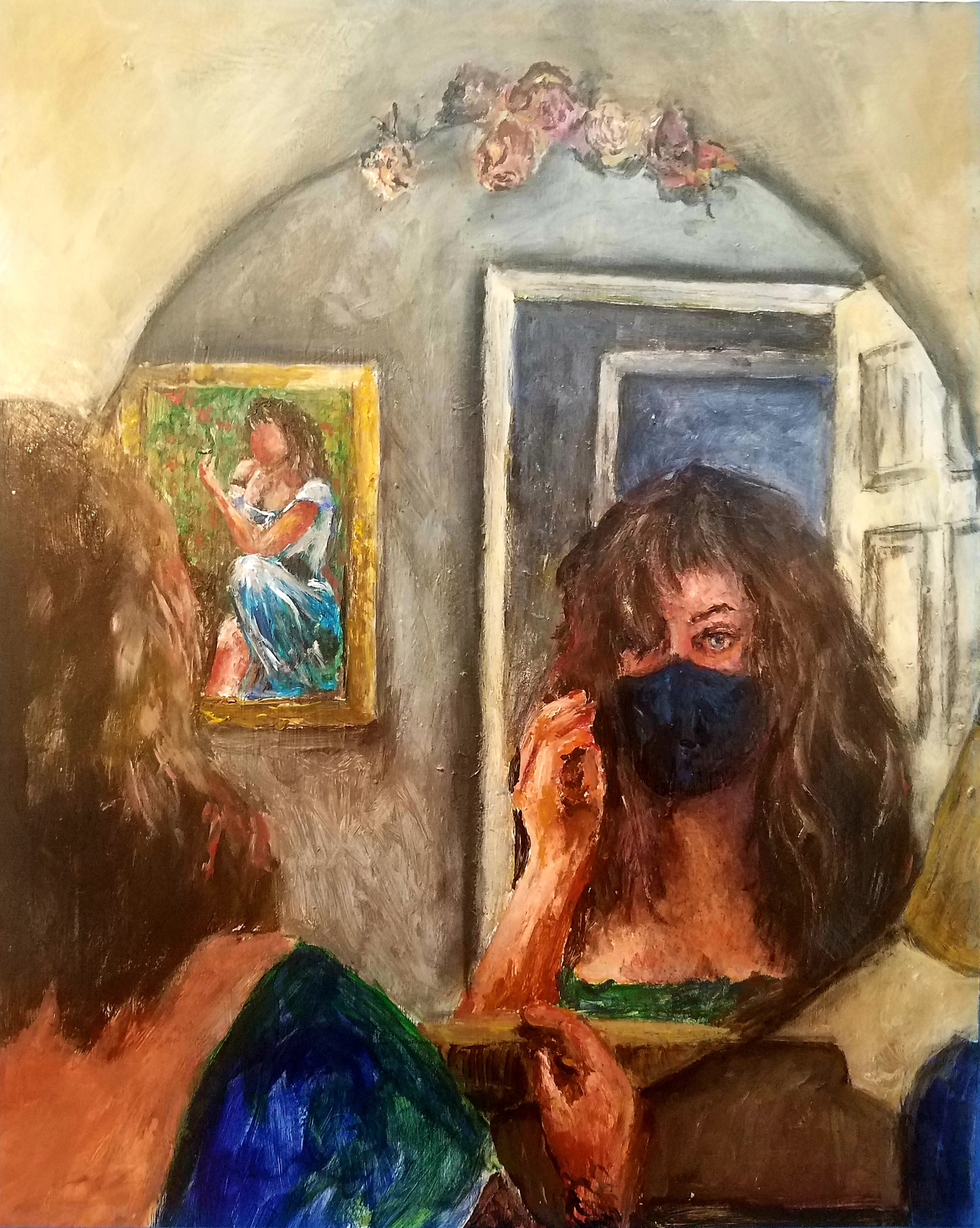 “Standards of beauty during COVID. Masks dominate our New World. When she sits down to prepare for a night out…she has given up wearing blush or lipstick. We have, for the history of humanity, relied on viewing the entire face to judge and understand communication. Now we are being reduced to muffled sounds behind masks – we rely almost completely on the movements and expression of the eyes.”