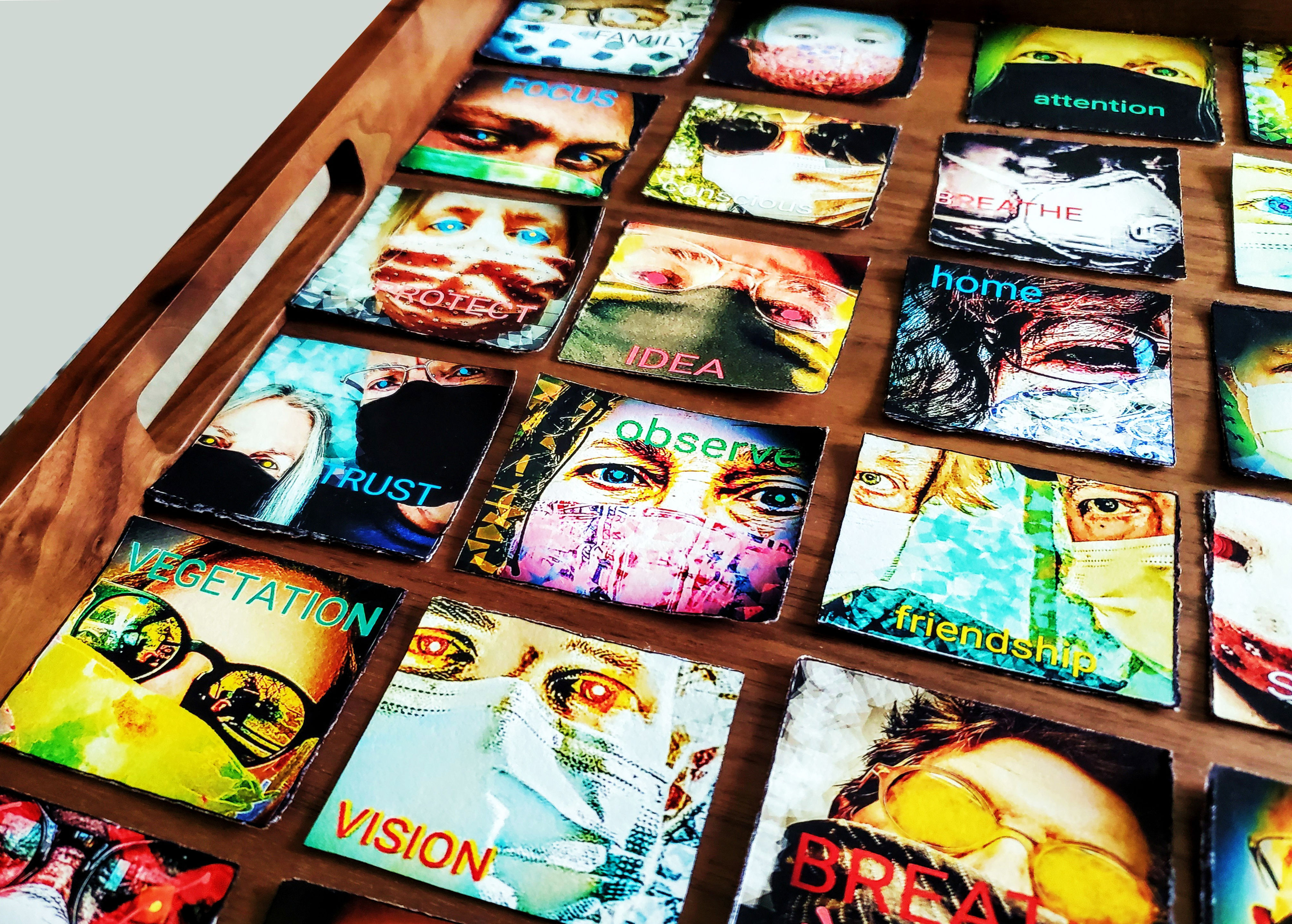 “I invited family and friends to text me photos of themselves in protective masks, then allow me to appropriate for my own manipulations – doing all quickly, allowing transformations at an unconscious level as far as possible. A word appears on each REMODEL connecting in some manner to the image and/or the virus. But, once again, added with little forethought, allowing fewer constraints with less overworking, thus the image is immediate, finalized, and sent to the masker. This seemed an interesting and timely project for days of isolation since requiring no direct contact, as well as giving me a project to work on during April and May 2020. The final presentation is a tray to serve masks & disinfectants on when we can again socialize at home. Includes 42 maskers & 6 MIAs.”