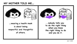 ARTIST BIO: Old, old illustrator trying to process the condition of this country and the world. In March, Dorothy Gehres Fraembs pulled out a yellowed tear sheet of a panel that she did in 1970 and added masks. As the year goes on, she keeps adding panels on FACEBOOK.