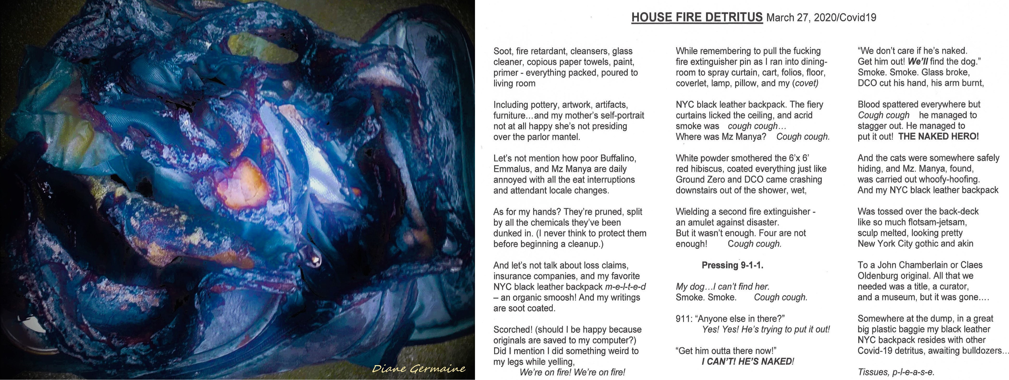 “Please refer to accompanying poem for description of a housefire that destroyed a NYC-made black leather backpack – melting it. I photographed the backpack in its new incarnation and then digitized the photograph. The backpack was unusable, unrecognizable, totally melted and smelled horrendous, but it was fascinating. Immortalized here.”