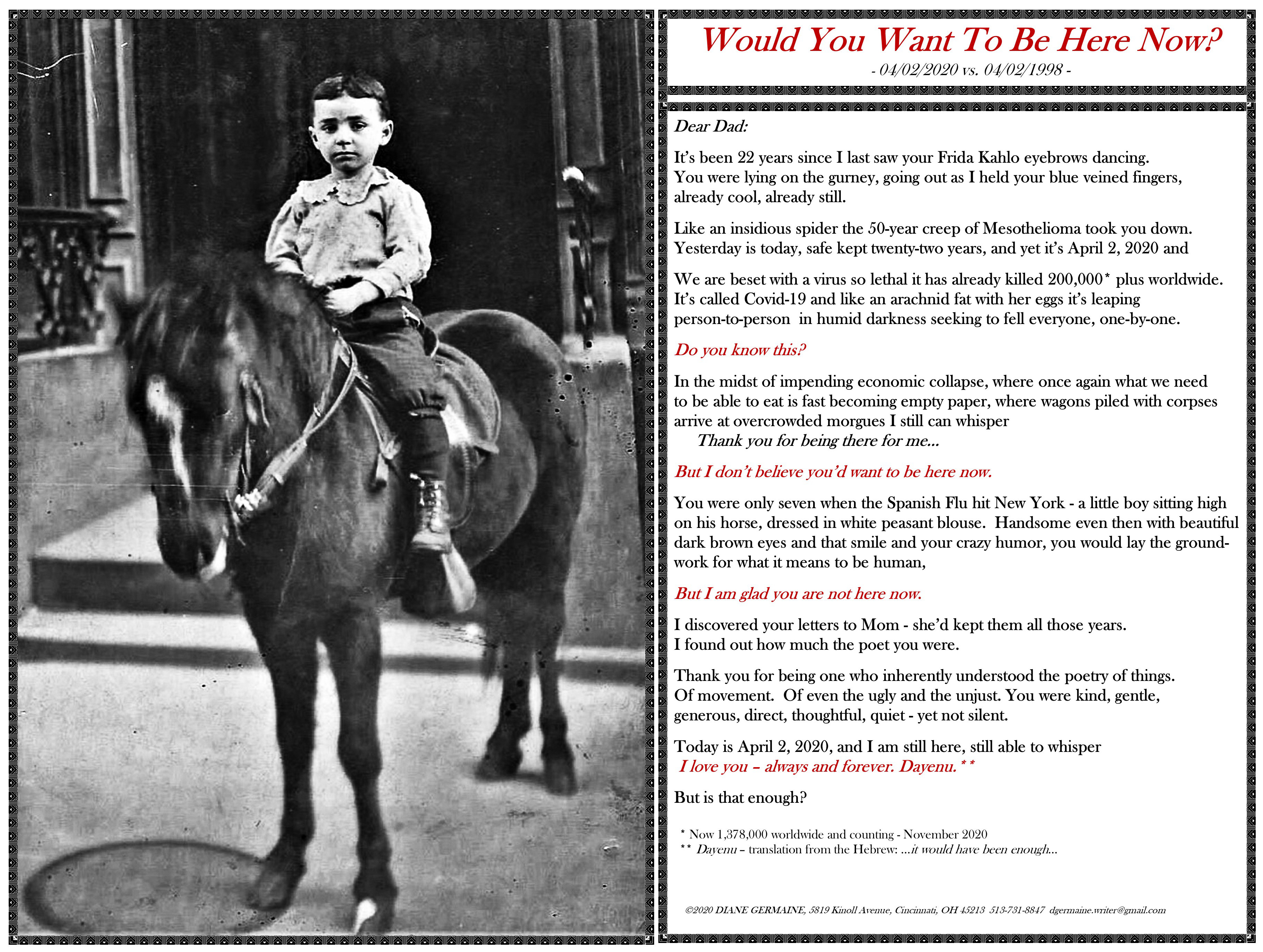 “April 2 (2020) was the anniversary of the death of my father in 1998. It was particularly poignant in light of the intense first wave of COVID19 and occurred right after a March 27th housefire that had threatened also to be devastating. This is an old black and white photograph from 1918, when my father was seven years old during the Spanish Flu pandemic. I have enhanced and edited the old photograph to bring it up to date.”