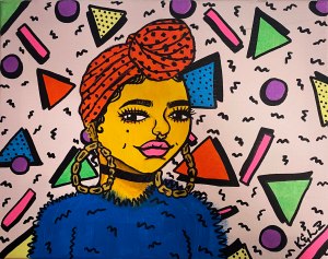 “This piece was inspired by the 90’s; I’m a 90’s baby. The background gives a nostalgic feel of how everything used to be designed back then, including her fuzzy sweatshirt and big bamboo hoop earrings.”