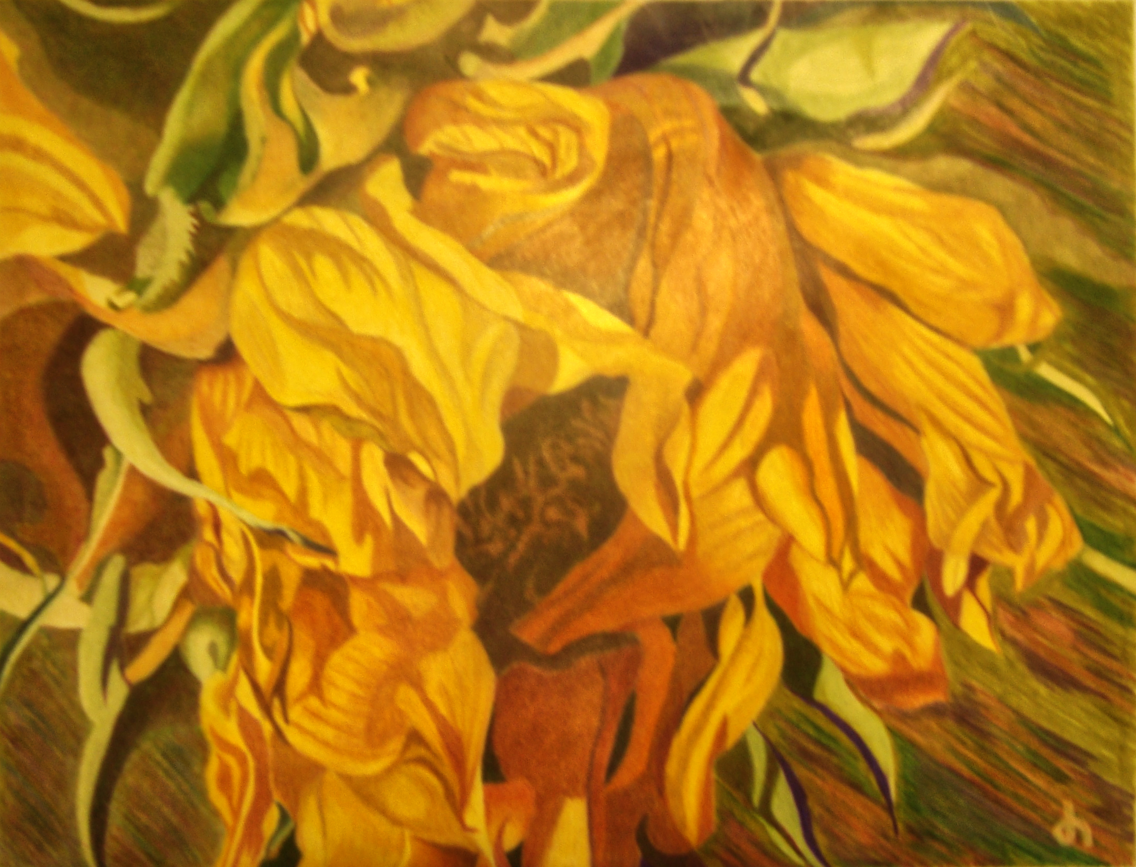 “I watched a bouquet of Sunflowers gradually droop in a big glass vase on my dining room table and this particular moment captured my eye. I imagined this flower growing in an unprotected space in my garden during a windstorm. What happens to a sunflower beaten by the wind? When we are confined we can deteriorate quickly. We must use our human creativity to make ourselves resilient while being buffeted by contradiction and irony. We’ll make it through.”