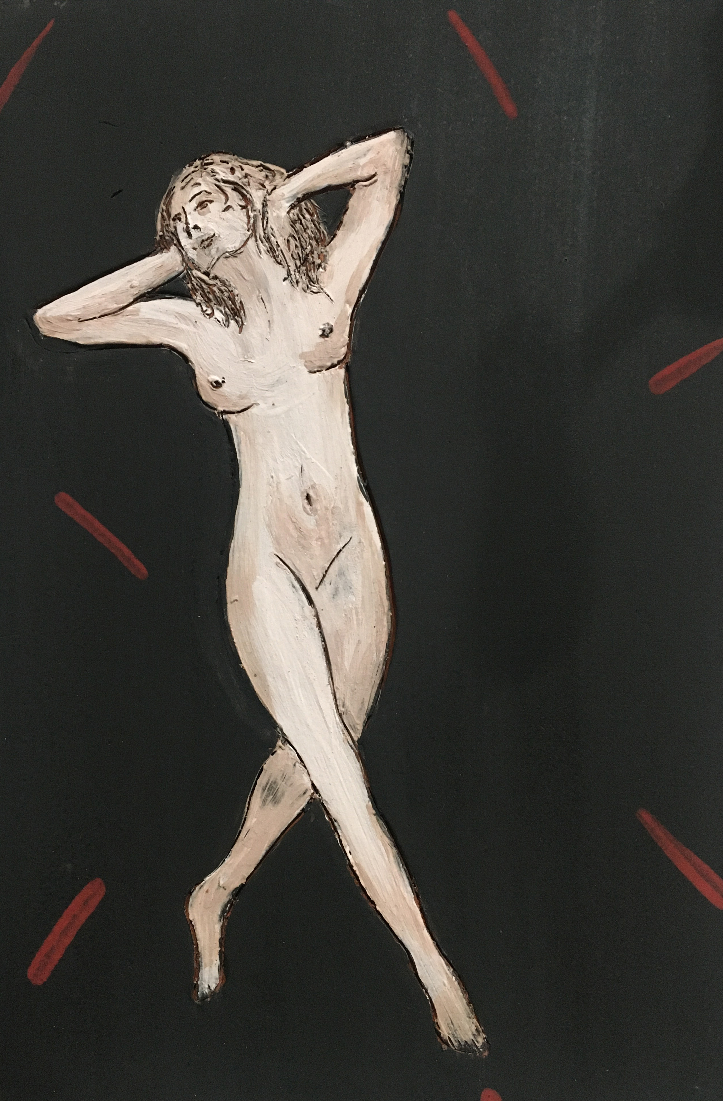 “Part of a series representing the female nude, with narratives portraying inside/outside meaning, her history, herstory, while navigating historical references. Taking a glimpse into the feminine psyche with a contemporary viewpoint of the female gaze, Stop the Chatter! portrays the constant bombardment of information on a daily basis on COVID-19 due to our 24/7 news cycle. She is fraught with misinformation especially being disseminated on social media and from our dangerous and corrupt government.”