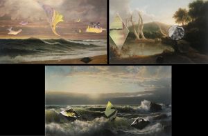 “I had beautiful reproductions of important American landscape paintings. When Covid hit it seemed a perfect opportunity to add unusual collage shapes to these landscapes. They are alien forms that have landed on our shores, just like Covid.”