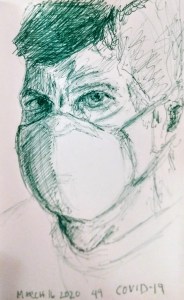 “This piece belongs to a series of birthday self-portraits. A trip to Spain was cancelled the week before and virus was running rampant in Italy. Months later at the time of this writing, Nov. 18, 2020, Covid- 19 cases are skyrocketing and yesterday’s death total of 33 Kentuckians set a new record for fatalities in the state due to the pandemic.”