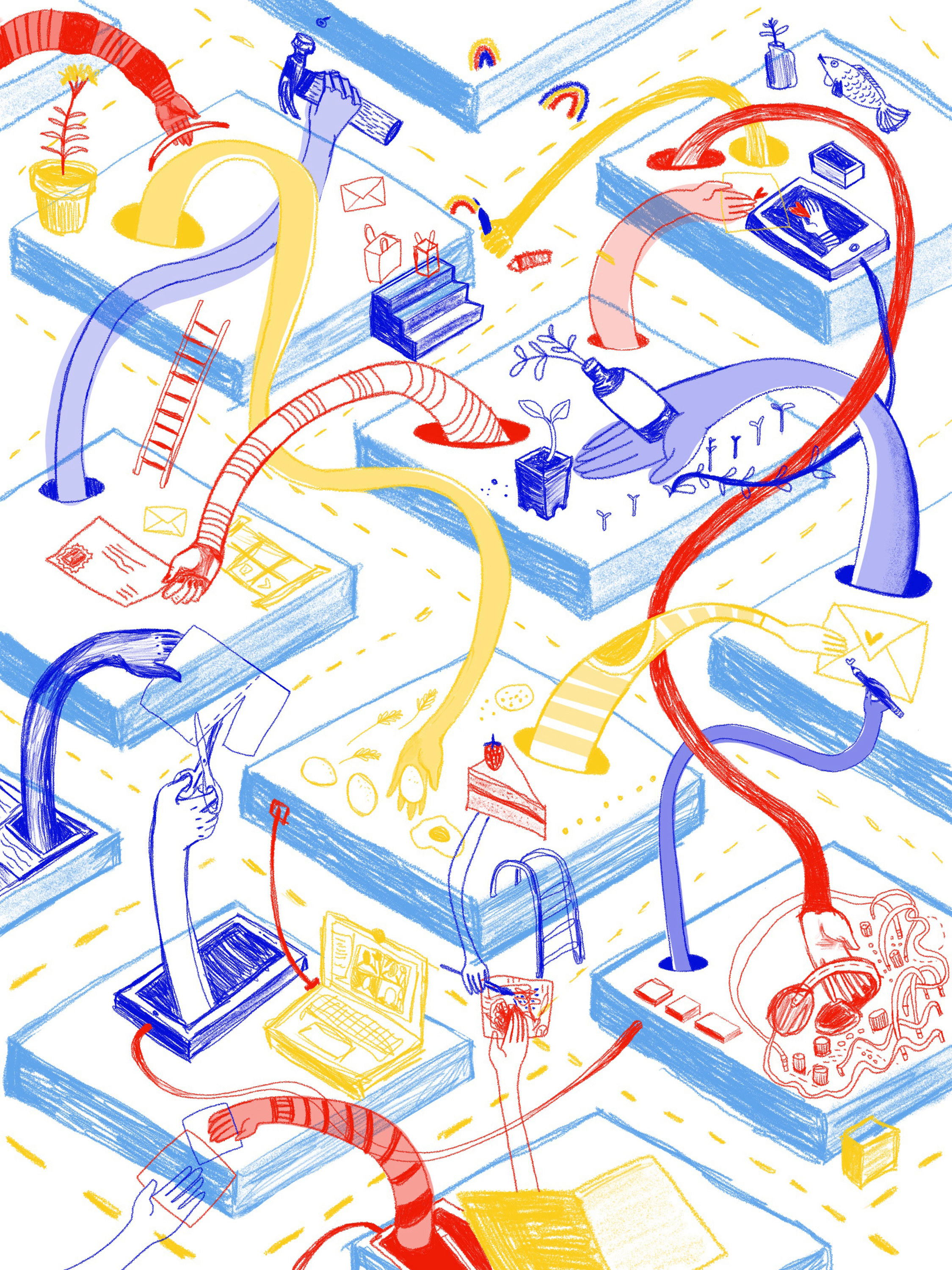 “This drawing is a reflection on distance and distancing, isolation then and now- and a little gratitude for internet access, technology, neighborliness, treats eaten on opposite sides of a porch, the people who want to help and help, the opportunity to drop groceries off for someone you can’t hug, and long distance collaborations.”