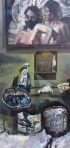 “Using a still life idea for a Mask Series, I created in this painting a surreal imagery, outside objects in snow on the bottom, masks in the center, and two women at the top. One woman wears a black mask as a green mist, symbolizing the virus, is emitted from the other’s mouth.“