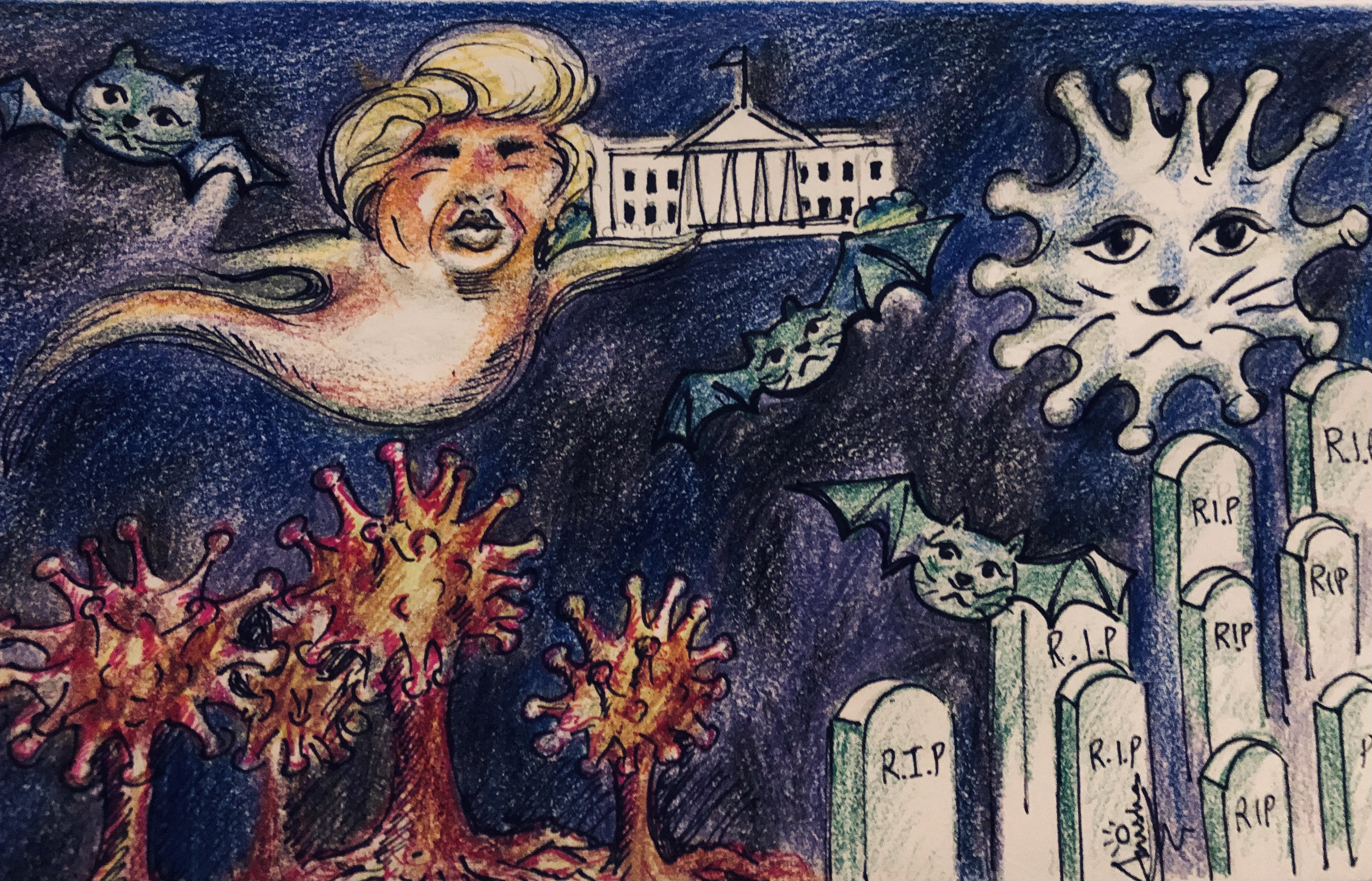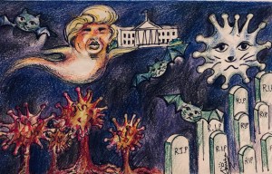 “My work ‘Bat Times’ sums up an unfortunate combination of Donald Trump being the president of the United States of America and the spread of the deadly Corona Virus pandemic apparently spread through bats from China. The leader of the free world doesn’t believe in wearing masks due to his lack of knowledge in science. This unforeseen virus has infected and killed millions of people all over the world while Trump continues to send bad signals to the people about the magnitude of the crisis and his denial to give–up on the White House. During these trying times when people need the leader of the free world to make sound and selfless decisions, Trump is shamefully focusing on continually being a self-centered businessman.”