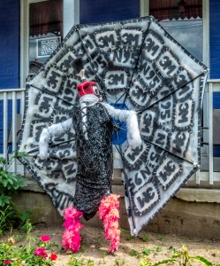 “The Northside community of Cincinnati sponsored an art show of scarecoronas to keep the virus at bay. Well over one hundred residents displayed their creations in their yards. The photograph shows one of my favorites.”