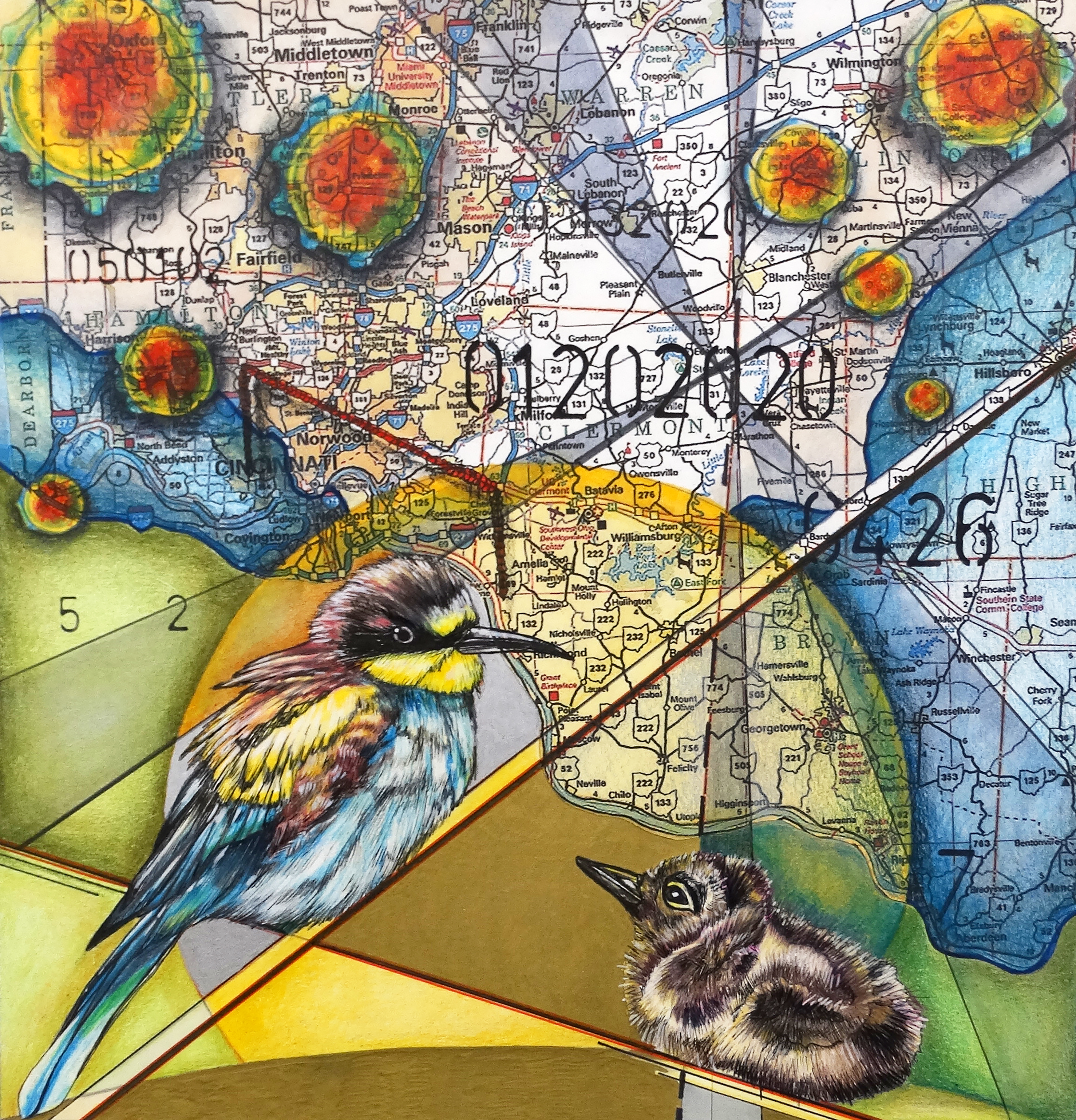 alcohol marker, acrylic paint, archival ink, prismacolor pencil, and collage materials; 12×11″