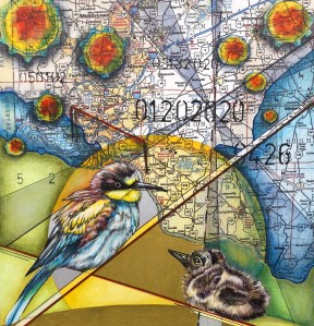 “’Pandemic Nexus’ is a commentary on the impact of the Coronavirus (COVID-19) Pandemic on the development and maintaining of relationships while in fluctuating stages of isolation. Numerological elements embedded in the image relate to dates significant to the impact of the Pandemic and subsequent moments of connection formed during chaotic times as well as representing symbolic elements of individuals. The network of linear intersections alludes to trajectories in life’s path and resulting convergences.