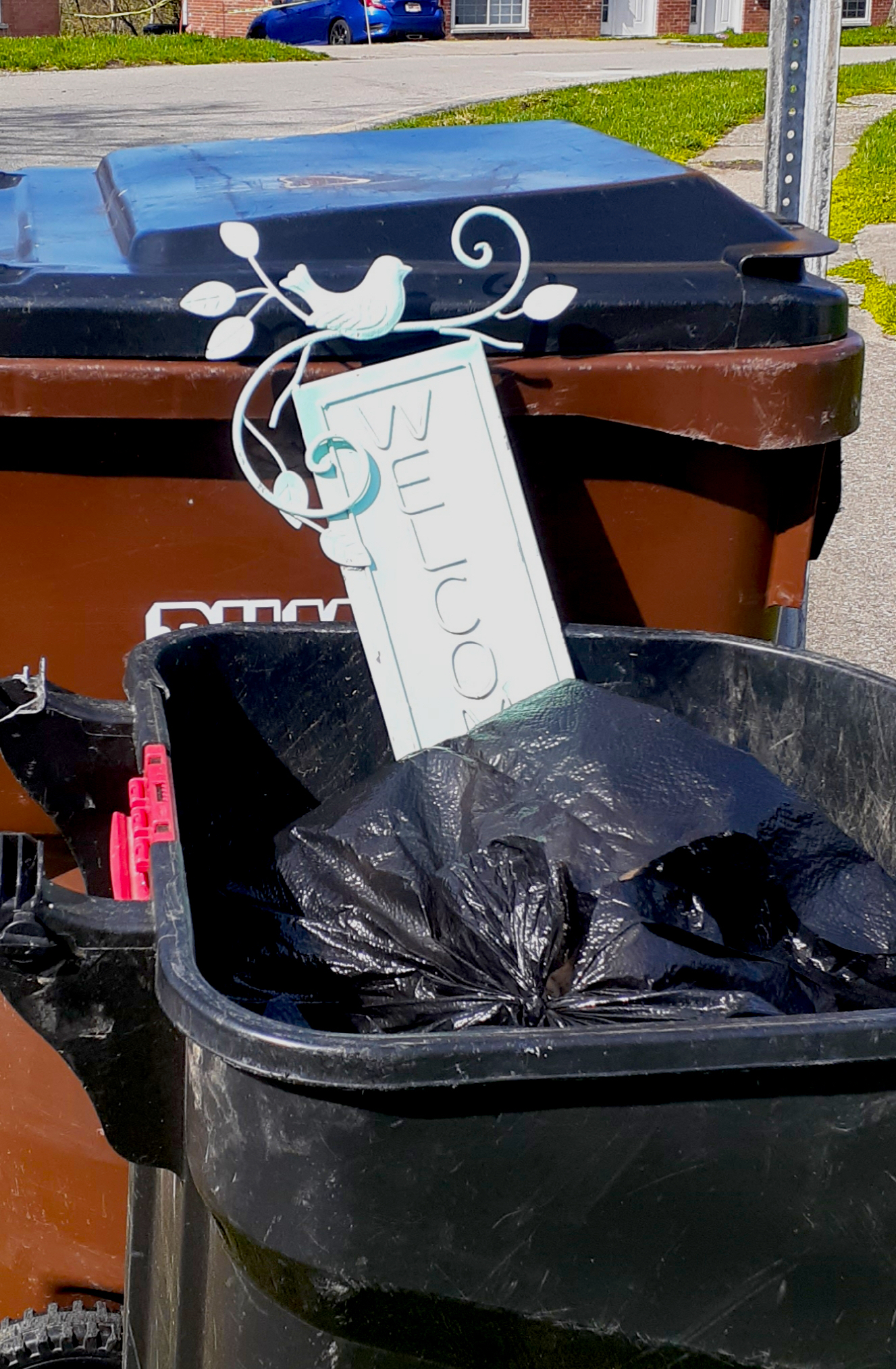 “This photograph was taken March 30, 2020, the garbage was not re-arranged for the shot, and it seemed clear that the neighbor had a statement to make.”