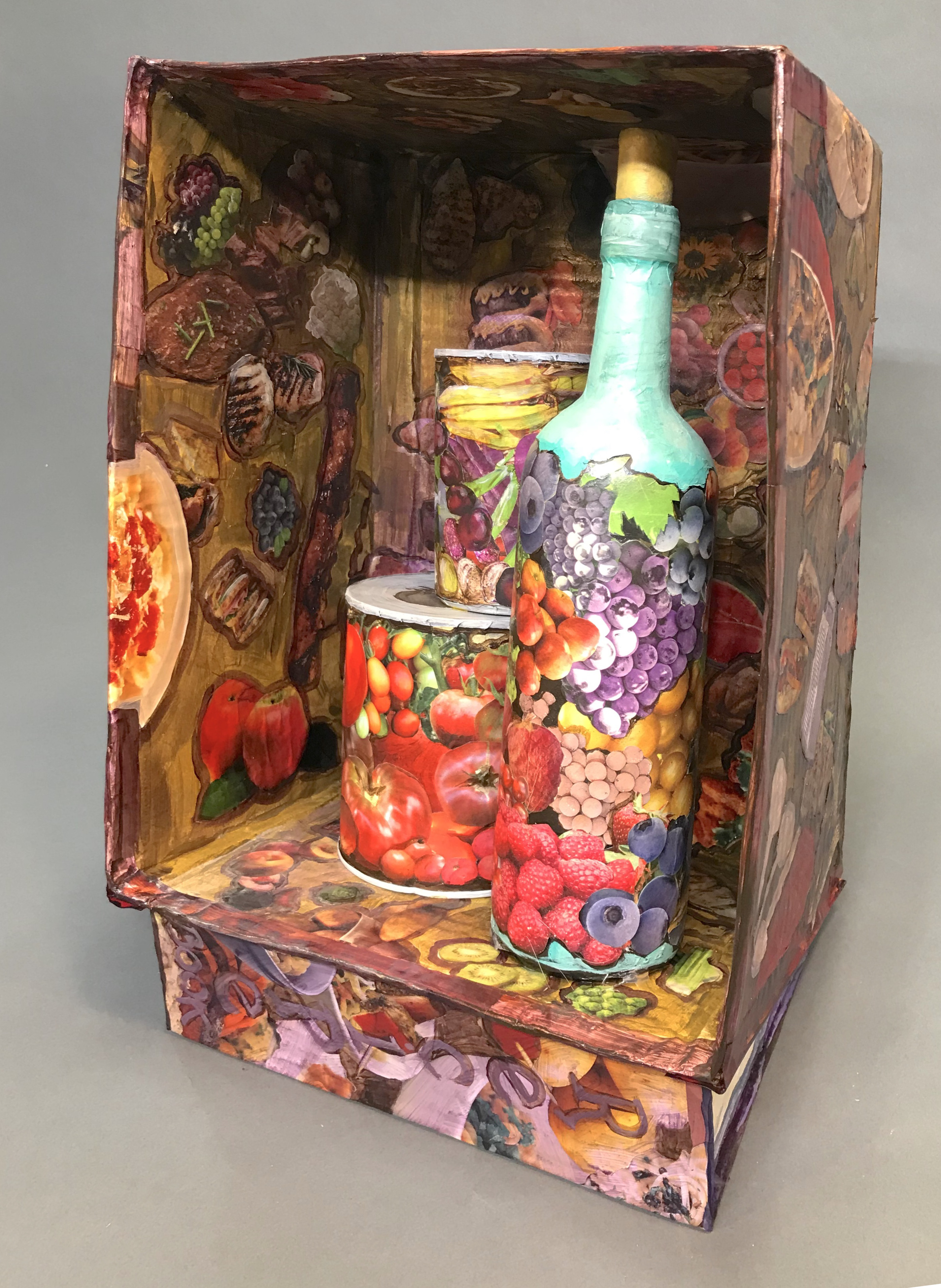 “This is an assemblage of recycled cardboard, cans and beverage containers, found food images, and paint used to build a rich visual environment from nothing, much like the “pantry” meals we were all supposed to master.”