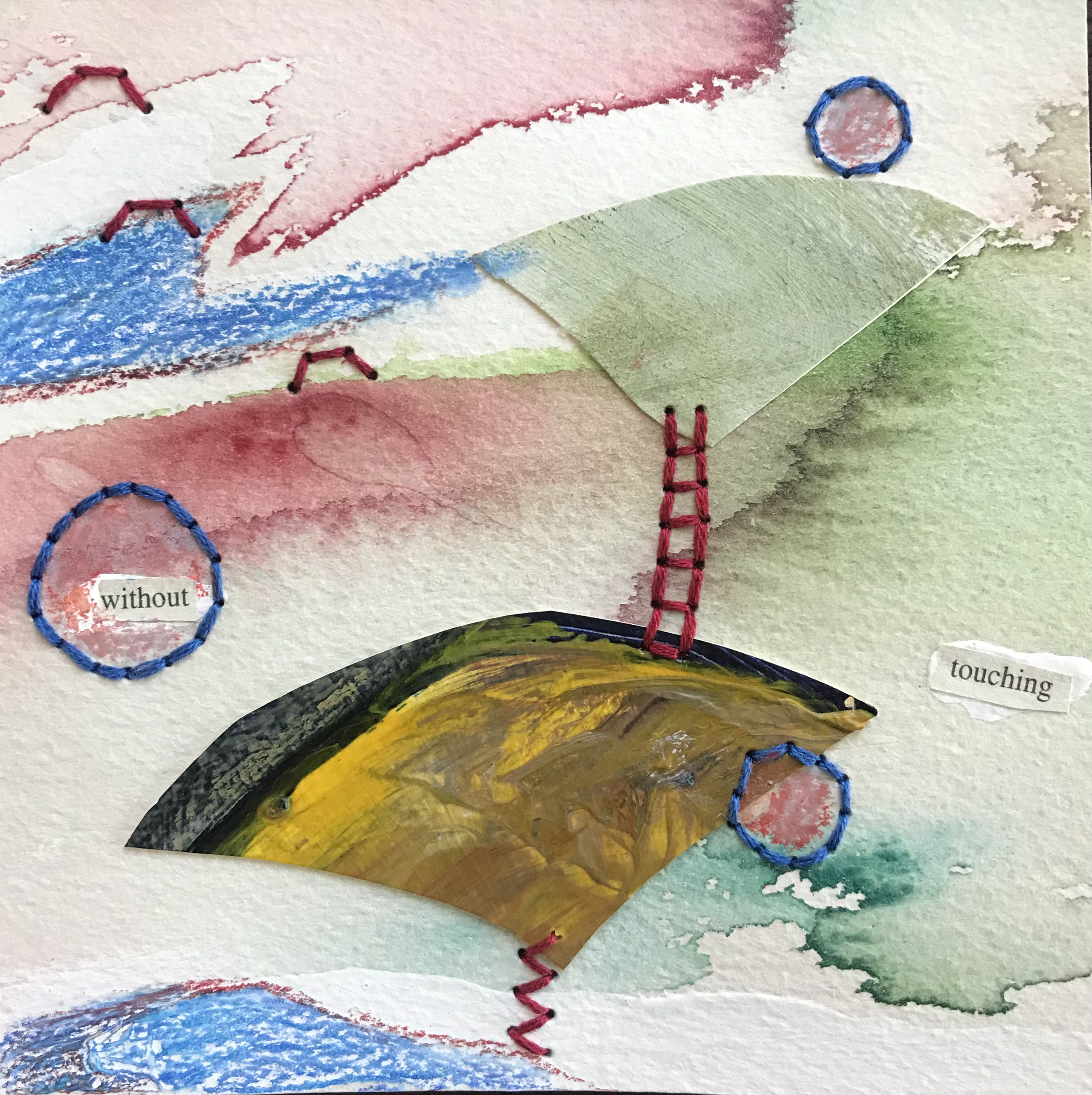 “Small collages represent a visual statement about faith and self-actualization. The process of adding stitchery slows down time and produces a meditation.”
