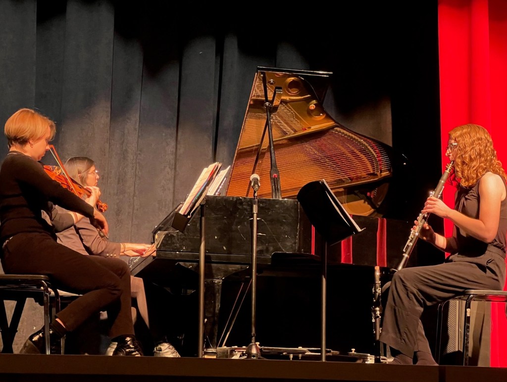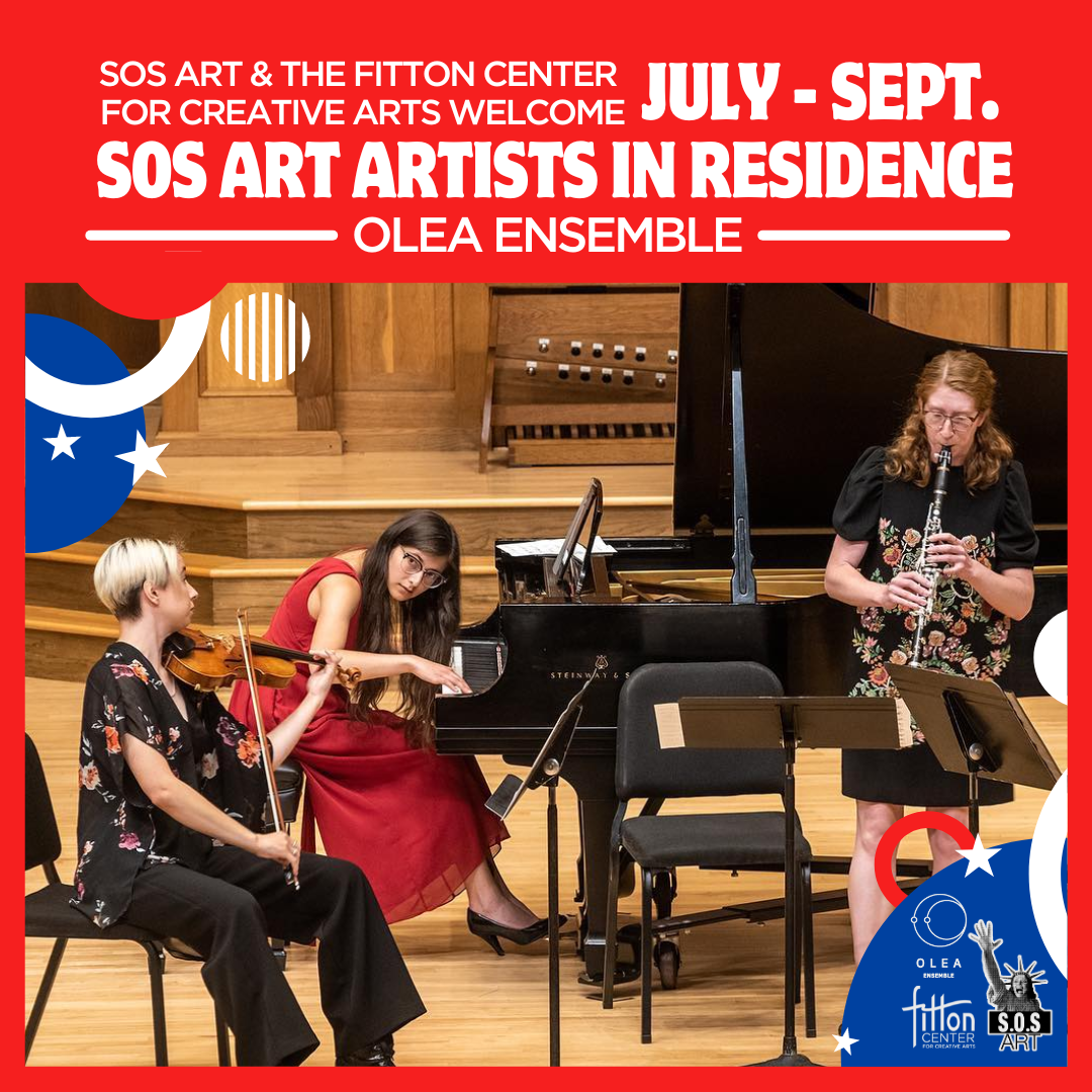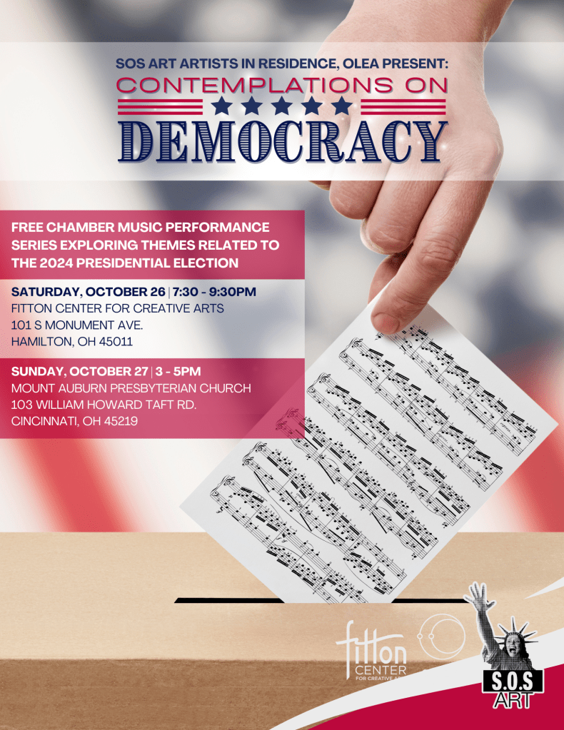 Our Artists in Residence for July – September 2024 were a chamber music ensemble called OLEA. The group, composed of Kate Kilgus (clarinet), Alayne Wegner (violin), and Marissa Kerbel (piano), spent their residency preparing a program entitled “Contemplations on Democracy” that used chamber music to explore themes related to the 2024 presidential election. Themes included Climate Change, Women’s rights, LGBTQIA+ rights, Immigration/Refugees, War/Foreign Conflicts, and Income Inequality among others. The music was accompanied by literary and visual works by Greater Cincinnati artists, relating to the same themes.