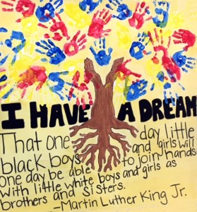 “CRC Clifton Center after school staff and children (ages 6-12), worked on the peace and justice theme in February, 2020 and reflected upon inspirational quotes from Martin Luther King Jr to create a large art work to exhibit in the center lobby. After making their own individual “I have a Dream…” quotes and wish statements, the children worked with CRC center recreation leaders to collaborate on the larger canvas using acrylic paints.”