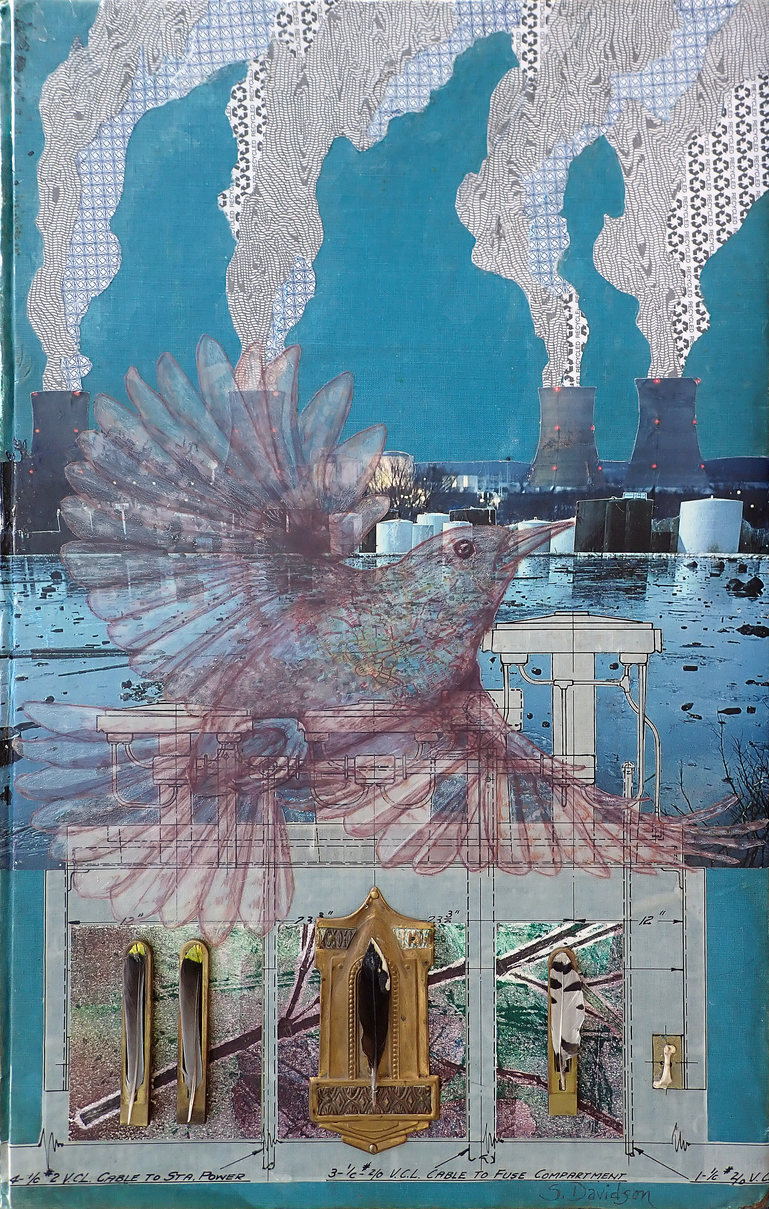 “In ‘Reliquary’ I have juxtaposed a drawing of a bird in flight over a background of power plants and pollution. Below is an antique engineering drawing, displaying in its ‘niches’ some feathers and a tiny bone. This draws a parallel with relics of the Catholic saints, memorials whose precious objects hold spiritual power.”