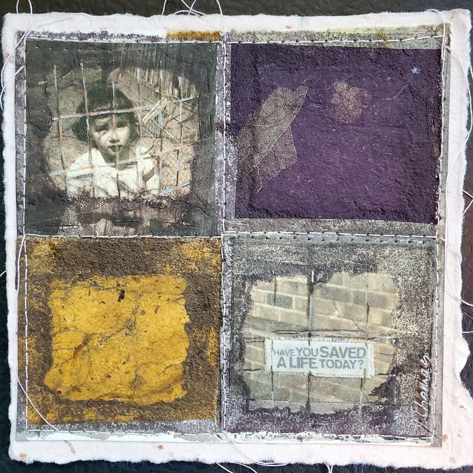 “This chine colle collagraph assembled and stitched on handmade paper is a response to the government’s mandate to separate immigrant children from their family along the border. The Red Cross slogan, “Have you saved a life today” references the loss of spirit suffered by these traumatized children.”