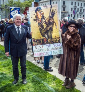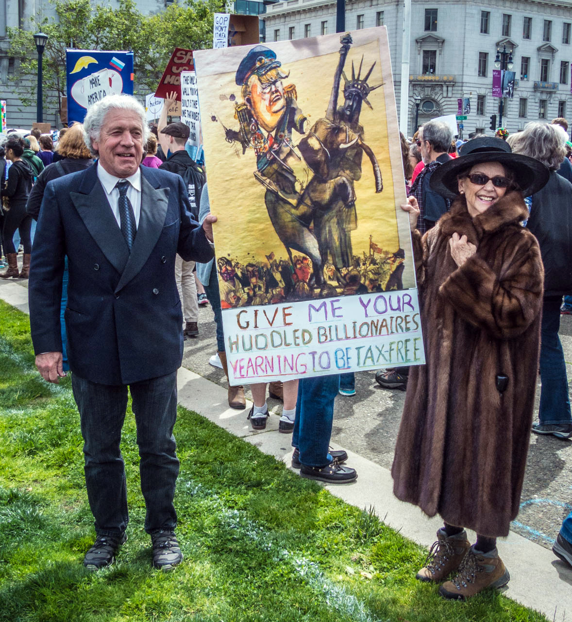 “Photograph of two seemingly rich people holding a protest sign at an anti trump rally.”