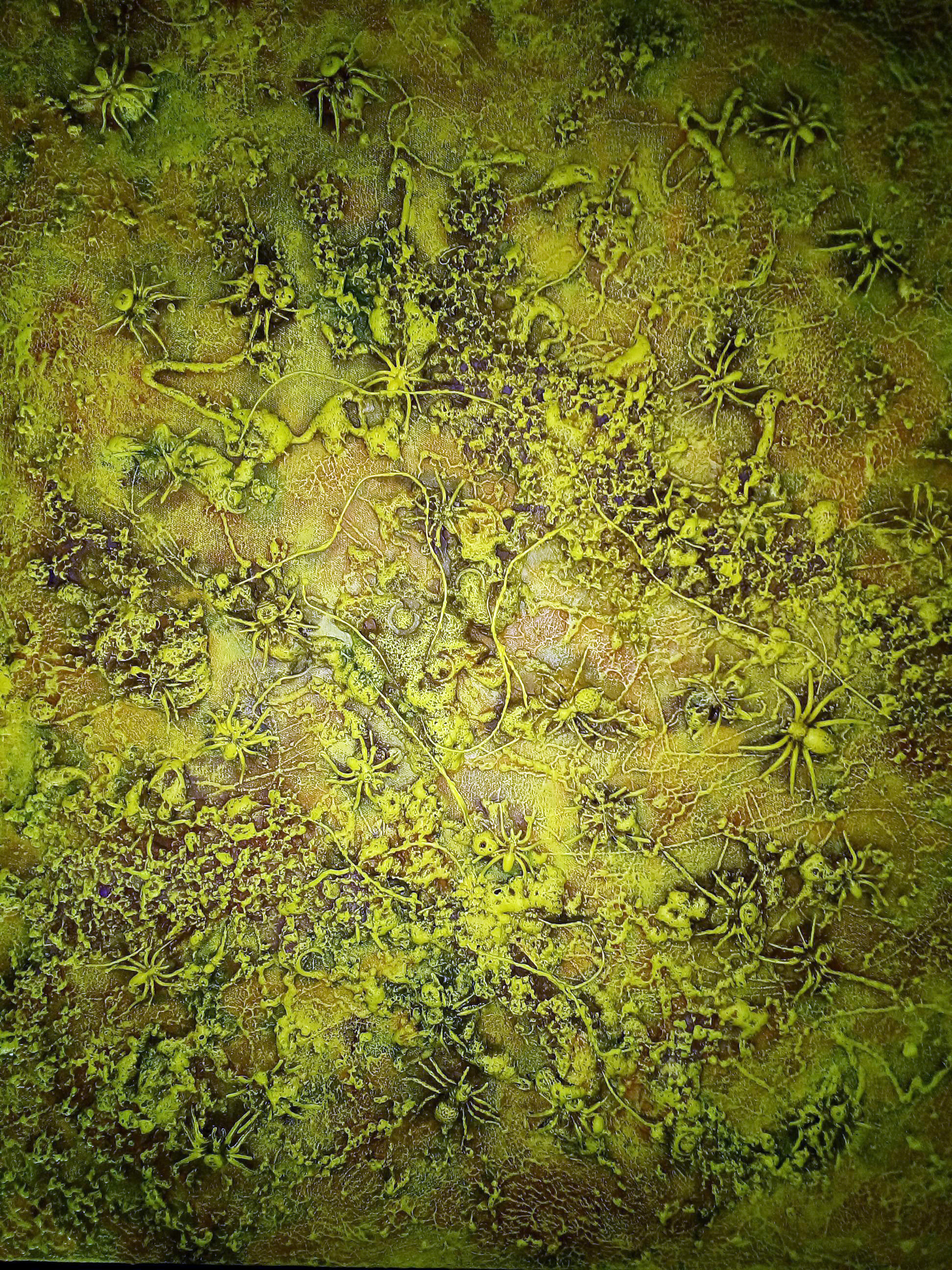 “Fossils have always interested me. They encapsulate a moment in time. The disregard for our natural surroundings by humanity will no doubt produce calamitous conditions for our environment. We are in the process of turning our planet into a man-made fossil. The title of my piece is a cautionary metaphor with fossilized spiders battling one another.”