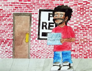 “My piece addresses the issue of rising homelessness in America. In January 2018, 552,830 people were counted as homeless in the United States; of those, 35 percent (194,467) were unsheltered. The homeless population on a single night represents 0.2 percent of the U.S. population, or 17 people per 10,000. I was inspired by an artist named Jim Conroy and in particular by his art piece ‘Anything Helps’”.