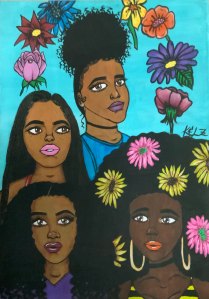 “This piece consists of 4 different women in different color shades. They’re showing off their cultural hair styles. Afro, box braids, fro puff and curls. Black is beautiful no matter what shade you are!”