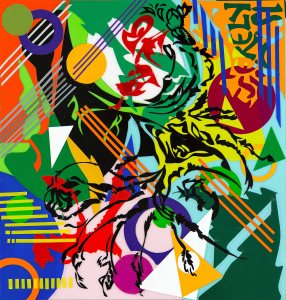 “When I create representational pieces in adhesive vinyl, I have lots of scraps left. In the interest of reduce, re-use, & recycle, I use these scraps to create abstract pieces. This is a result.”