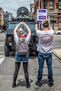 “Two protestors are seen confronting an armored police vehicle in downtown Cincinnati.”