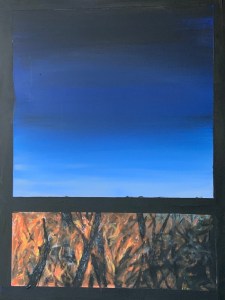“My painting is in two sections; the top, a serene blue sky, and the bottom, a raging wild fire as if nature is getting justice.”