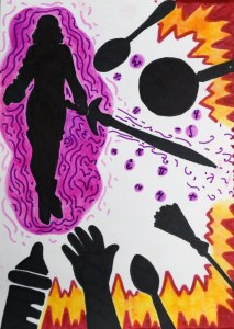 “Drawing and Printmaking students at Oak Hills High School, working under the guidance of art teacher Jamie Schorsch, created a narrative image based upon one of the story vignettes from “Girl Rising” that they selected for inspiration. The compositions demonstrate the unification of notes and sketches taken during the viewing of “Girl Rising”, research related to the stories, and project planning completed previously. The artwork of Kara Walker served as inspiration for the silhouetting of the resulting images that convey the struggles that girls face around the globe in receiving and education.”