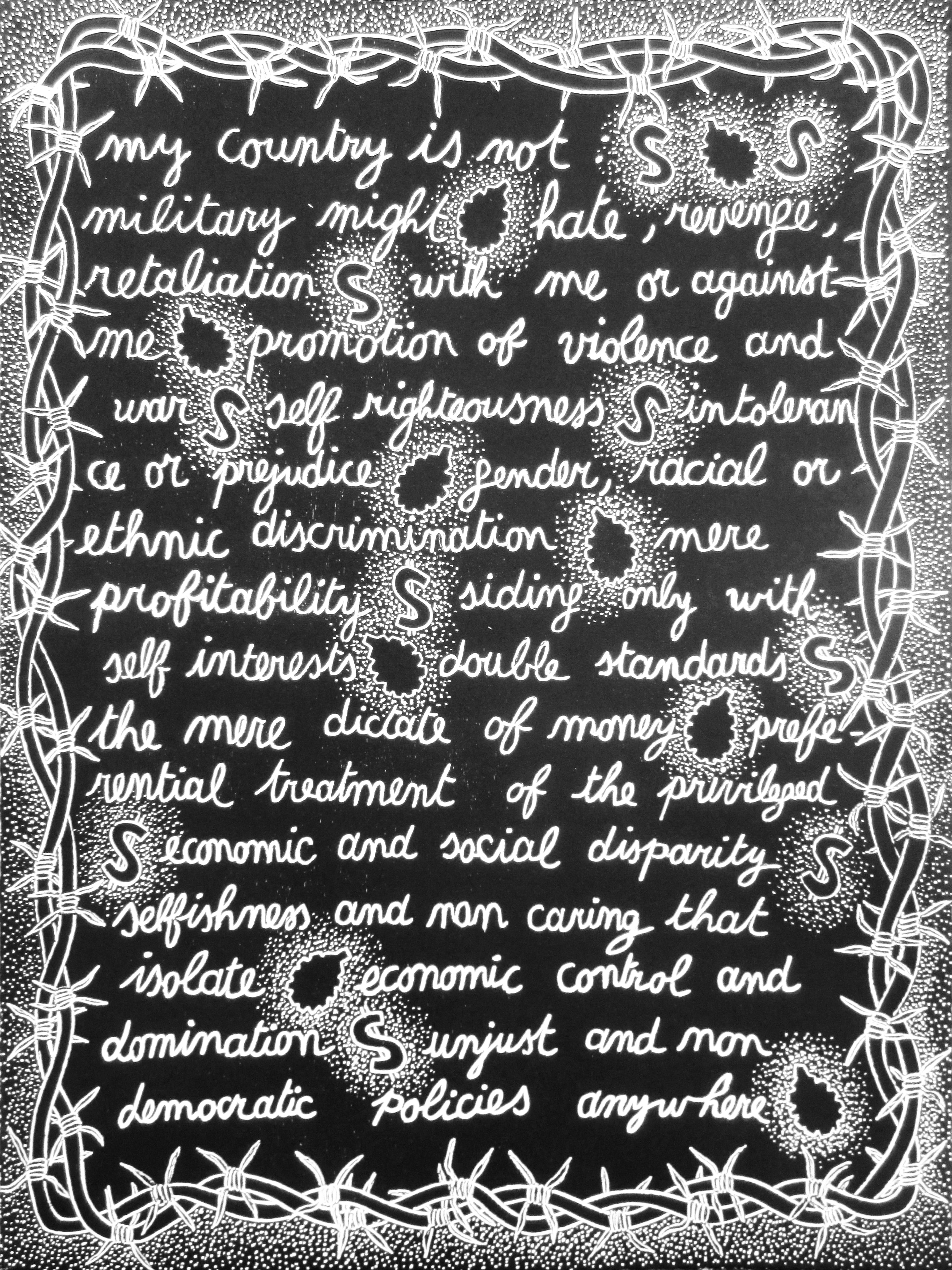 “In my 2 woodcut prints ‘My Country Is’ and ‘My Country Is Not’, I wanted to state what being patriotic meant to me, i.e. what kind of country I wanted, and what were the ethical, moral and social justice premises I would like it to adhere to. Being patriotic for me is surely not accepting the status quo with its flaws and injustices that i would be helping perpetuate unless I raise my voice against them and point to their alternative.”