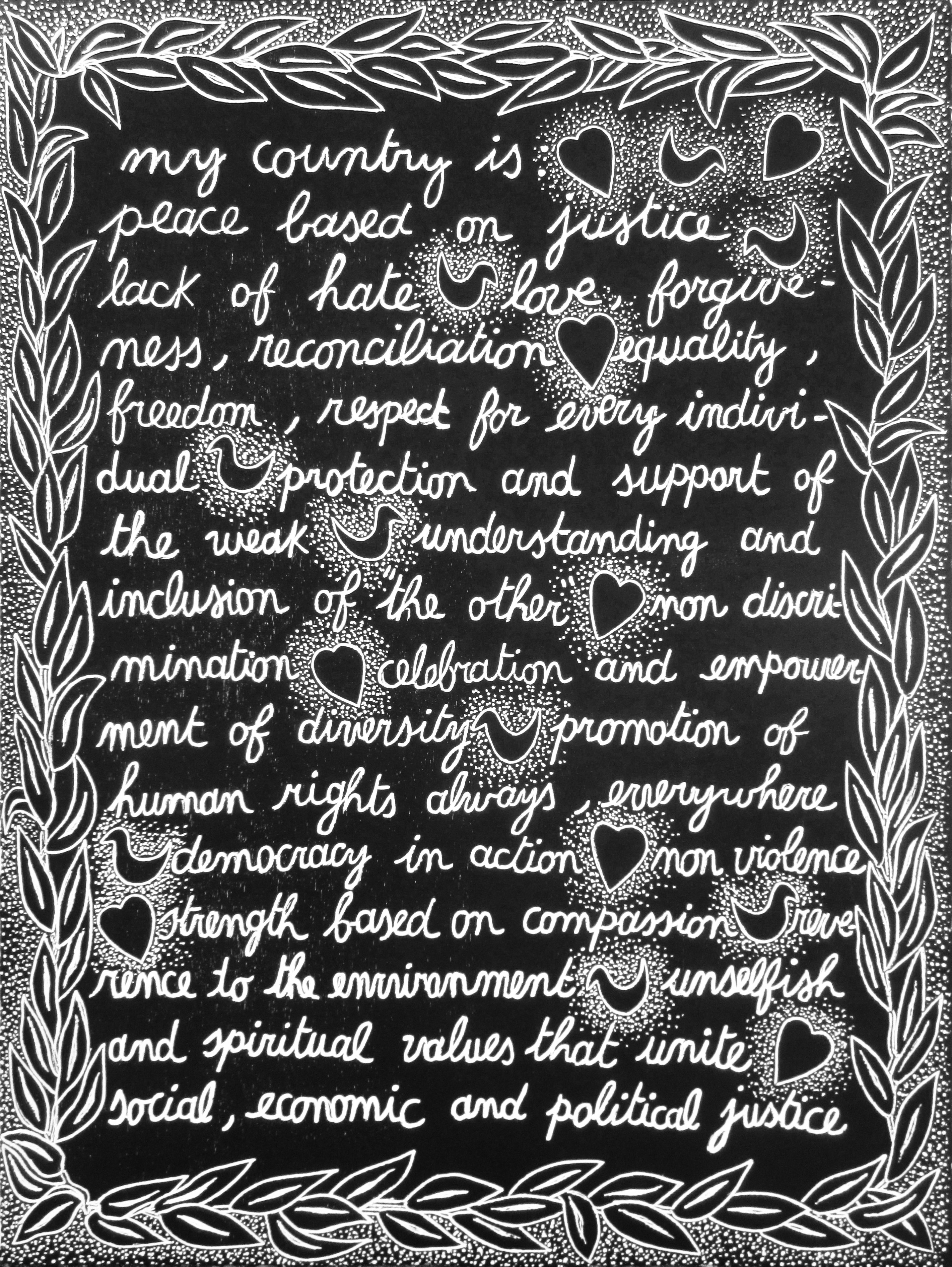 “In my 2 woodcut prints ‘My Country Is’ and ‘My Country Is Not’, I wanted to state what being patriotic meant to me, i.e. what kind of country I wanted, and what were the ethical, moral and social justice premises I would like it to adhere to. Being patriotic for me is surely not accepting the status quo with its flaws and injustices that i would be helping perpetuate unless I raise my voice against them and point to their alternative.”