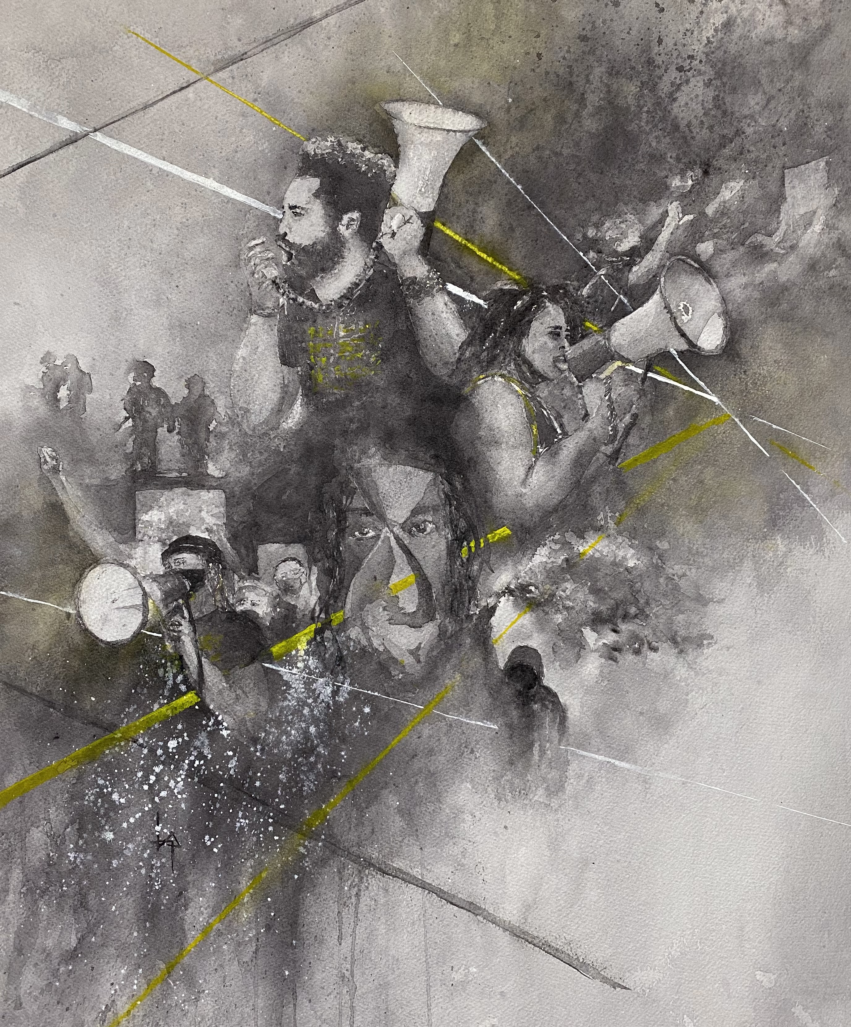 “un/rest celebrates the Black Lives Matters activists and their courage in challenging systems of racist oppression. Against the backdrop of the current, brutal reality for so many Black folks, un/rest embraces the movement’s hope and promise of a more equitable future. Drips, splatters, and lines allude to the streets that serve as places to gather and protest, but also so often the sites of unconscionable, racist harm and death. un/rest sits at this intersection, demanding discomfort, justice, and humanity as we cross the boundary of what is and pursue the possibility of what could be.”