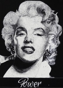“Working under the guidance of art teacher Jamie Schorsch, students at Oak Hills High School researched an individual, an icon of society, who has impacted and influenced society in a positive way. Using a stylus, with a variety of Scratchboard tools, they carefully observed details, textures, highlights, and shadows. They chose a term as a descriptor of the selected icon and included it in the work in order to summarize the individual’s life or characteristics.”