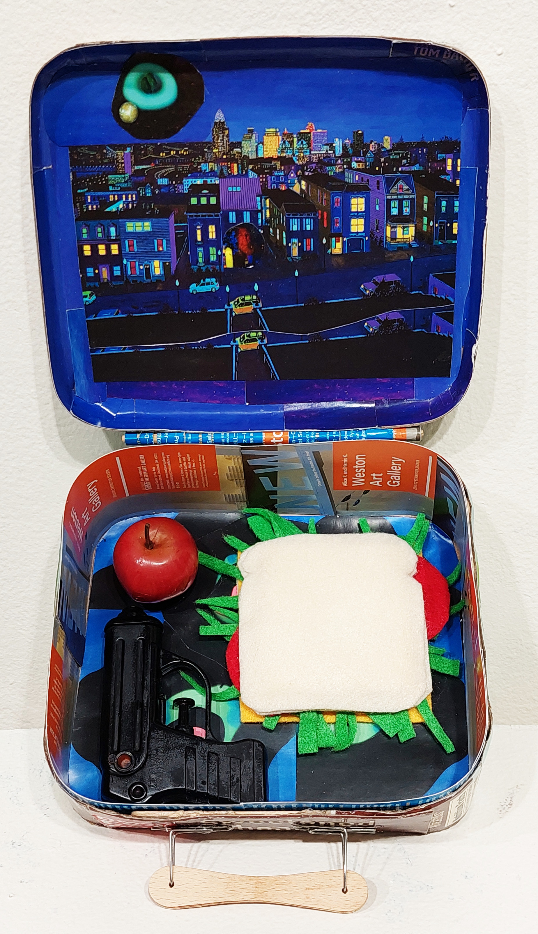 “Two people from my immediate family have been shot by other family members, one died, one survived. I was taught to shoot a twelve gauge shotgun and a thirty eight by my father and brother when I was twelve years old. When I moved to the CUF neighborhood I was stalked and robbed. My dad wanted to give me a handgun to carry. I thought about it for one month and decided I did not want to live my life armed. Gun control has become one of my passions. It saddens me to see the direction our country has taken as far as gun ownership. The school lunchbox, created in collaboration with Rolf Kuhn, illustrates this very disturbing trend.”