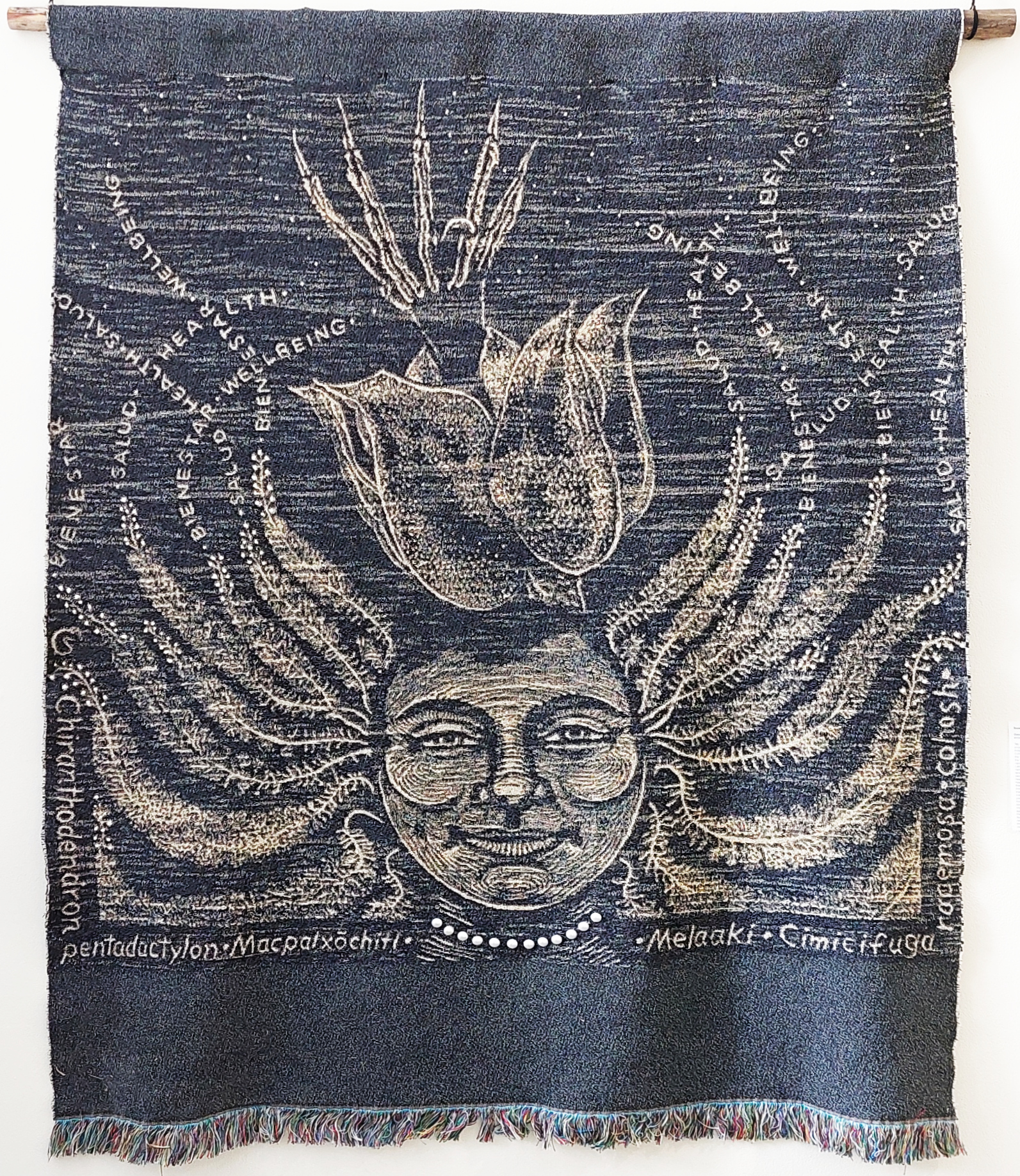 “My embellished blanket focuses on the healing properties of two plants utilized by two different Indigenous groups—the melaaki plant (Black Cohosh) used by the Shawnee Tribe of Ohio and the macpalxochitl (Palm Flower Tree) used by the Nahua peoples of Oaxaca. I present the plant names first in the Indigenous language, then in Latin and in the case of melaaki I also include its name in Algonquin (cohosh). I want to return the lens to the medicinal wisdom of Indigenous peoples. The English and Spanish words for health and well-being spring from the person’s headdress because in these parts of the world these two languages now dominate. The two Indigenous groups represented here tended these plants in positive ways to create good medicine for their people. But both of these plants are now much rarer/endangered due to the acts of genocide, removal, incarceration, and assimilation perpetuated by the colonial imperialistic forces throughout the Americas against Indigenous peoples and assaults against the environment wrought by these same forces. As a citizen of the Shawnee Tribe, I advocate for reclamation and restitution of planetary health through a practice of good medicine|buena medicina.”