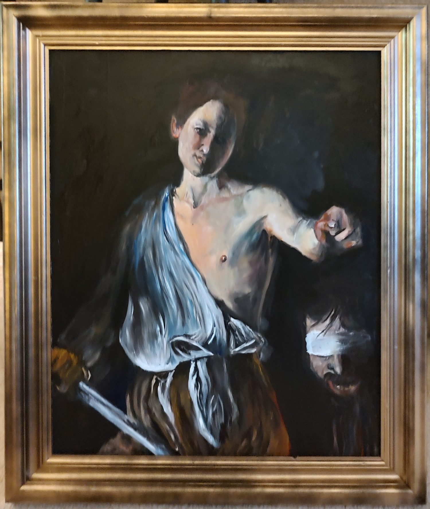 “This piece is a reimagining of Caravaggio. It represents the smaller David as knowledge and the larger Goliath as hate and ignorance. It does not take a major institution to eradicate ignorance. Small acts of kindness can have exponential effects.”