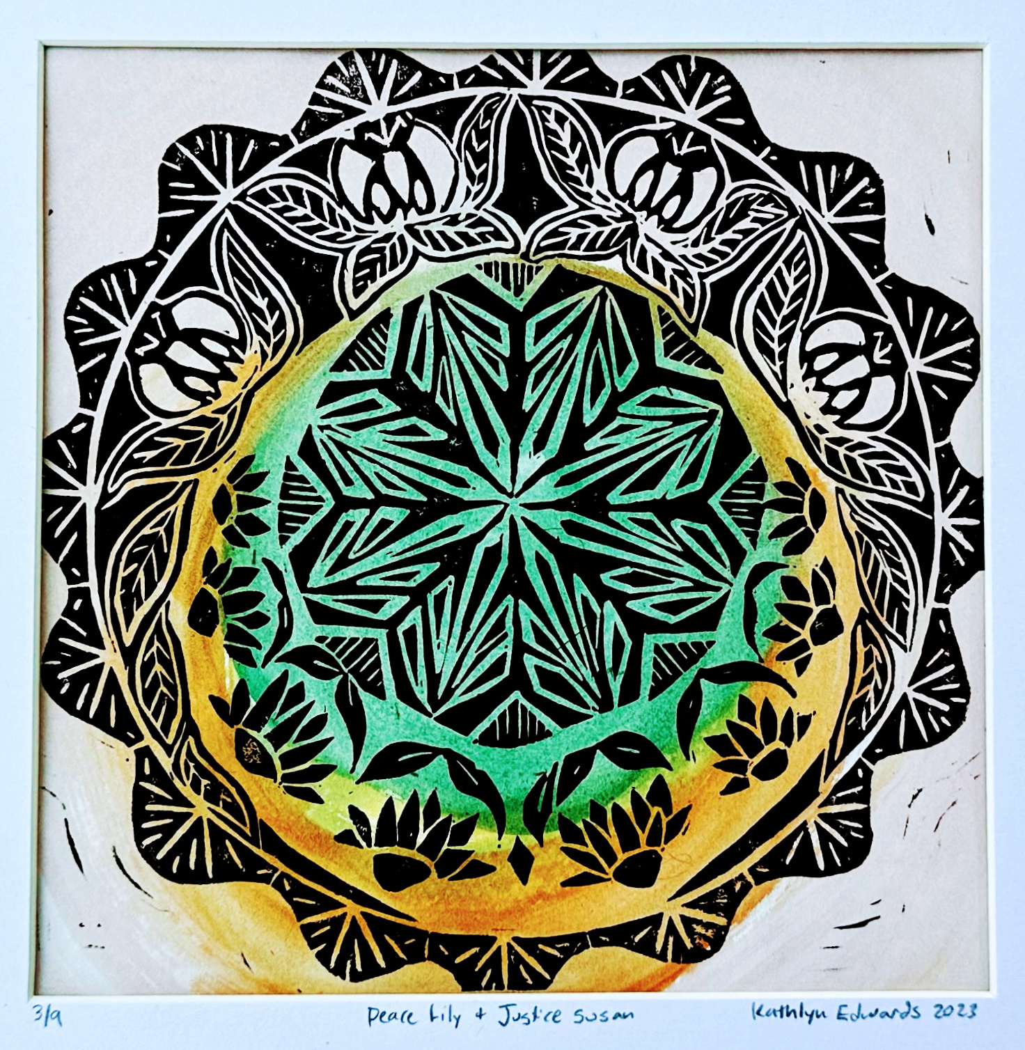 linocut and watercolor; 6×6″