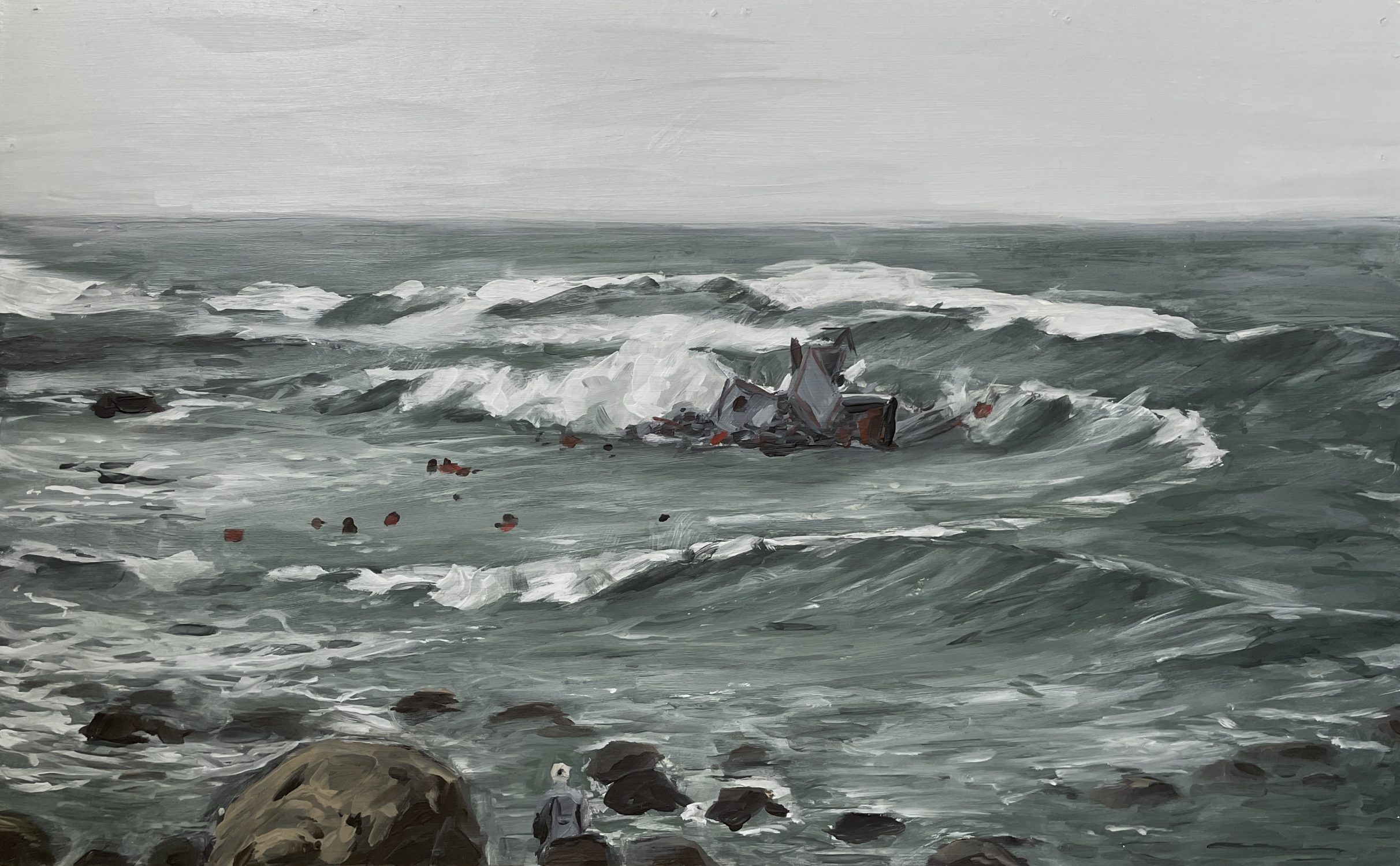 “This painting depicts an immigrant boat accident that I witnessed at Point Loma, California. I want to acknowledge the 3 individuals that drowned during the incident. It is important for us to be aware of the humanitarian crisis that is happening at our southern border. This is just one of many incidents, and I encourage the viewer to make a stand for new legislation that does not involve any more human exploitation, or death in our free nation. Upon purchase, 10% of proceeds will go to Mexico International Committee of the Red Cross.”