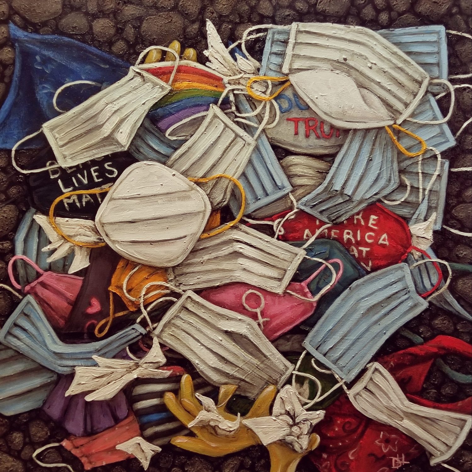 “This piece is from my series “Penchant” which confronts our cultural obsession with consumption and waste. During the pandemic, single use meant safer, and within a matter of days, a new type of trash was all over the ground – masks. Beyond the pandemic, there was so much political and social unrest, masks became a way for us to proudly display the side we were on, furthering the divide. Waste and environmentalism, issues that fell to the wayside during that time, could be the bridge that reconnects those divisions.”