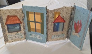 “Book screen made with handmade paper and cut outs lined with translucent rock paper.