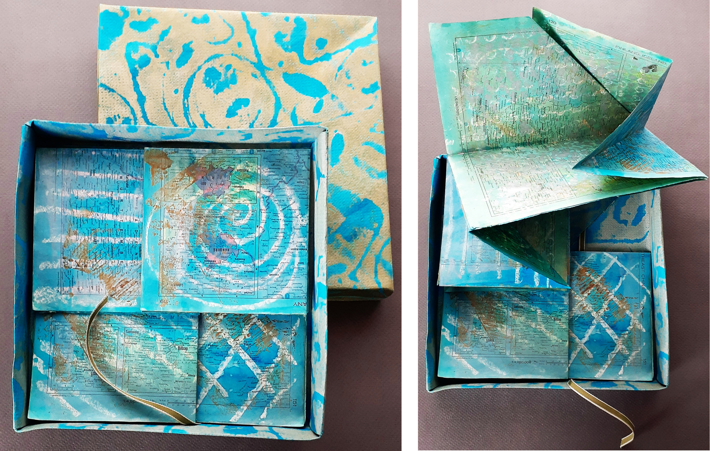 “Wax-resist and relief-printed maps folded to represent the challenges to the health of our oceans and waterways. Relief-printed masu box.”