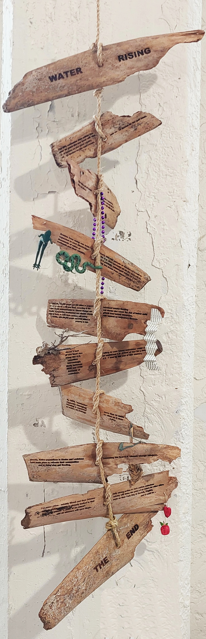 “Text engraved into fragments of palm bark washed ashore from the Gulf of Mexico by hurricane Ian shares the realities of the consequences of rising sea levels caused by climate change.”