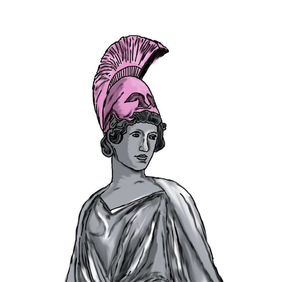 “Depiction of Athena, Goddess of order in the City. Also known as Athena Parthenos. Sister of Apollo, virgin daughter of virgin birth of Apollo. Grey-eyed goddess of wisdom in war.”