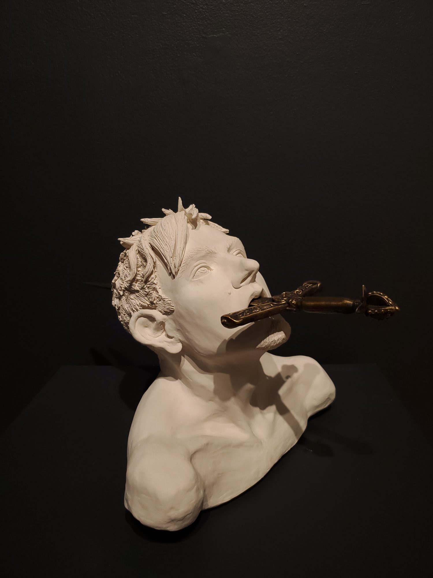 “This piece is a self portrait and is my most personal. It is meant to convey the feelings of betrayal from my first long lasting relationship. The relationship in question is represented with strawberries, which my partner loved, and the blade is decorated in. The figure is numb, lost and emotionless to show how I felt after the situation. I used this work and others in the series to help myself move on from these hurt feelings, reconcile with my friend, and realize I had my own faults to apologize for.”